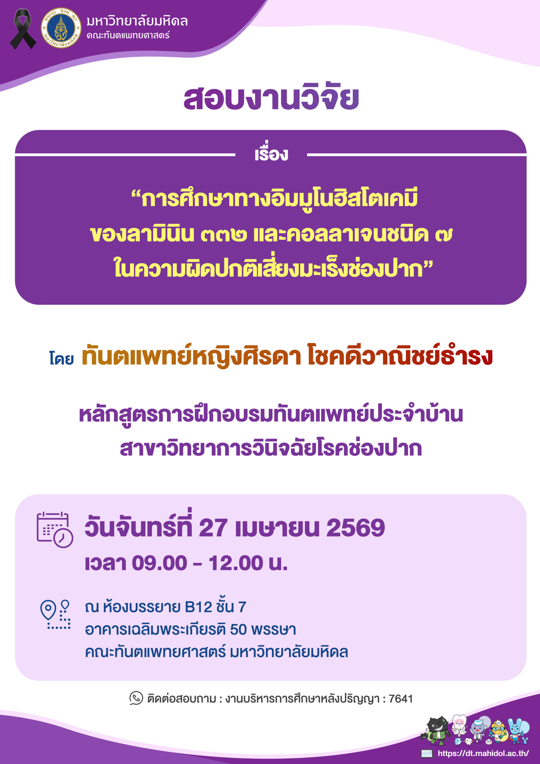 วันเวลาที่สอบ : 27 เมษายน 2569 เวลา 09.00 – 12.00 น. สถานที่ : ณ ห้องบรรยาย B12 ชั้น 7 อาคารเฉลิมพระเกียรติ 50 พรรษา