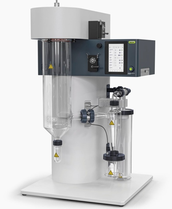 เป็นเครื่องทำแห้งแบบพ่นฝอย สามารถใช้ตัวอย่างจำนวนน้อยประมาณ 50-100 มิลลิลิตร ปริมาณตัวอย่างเริ่มต้นที่ 5 กรัม ตัวทำละลายเป็นน้ำหรือตัวทำละลายเป็น Organic Solvent สูงสุดได้ 20% โดยไม่ต้องปรับเปลี่ยนตัวเครื่อง เครื่องแสดงพารามิเตอร์เป็นหน่วย SI ตัวอย่างสามารถระเหยได้ประมาณ 1 ลิตร/ชั่วโมง ขนาดอนุภาค 1-60 µm สามารถตั้งอุณหภูมิได้สูงสุด 220-250°C